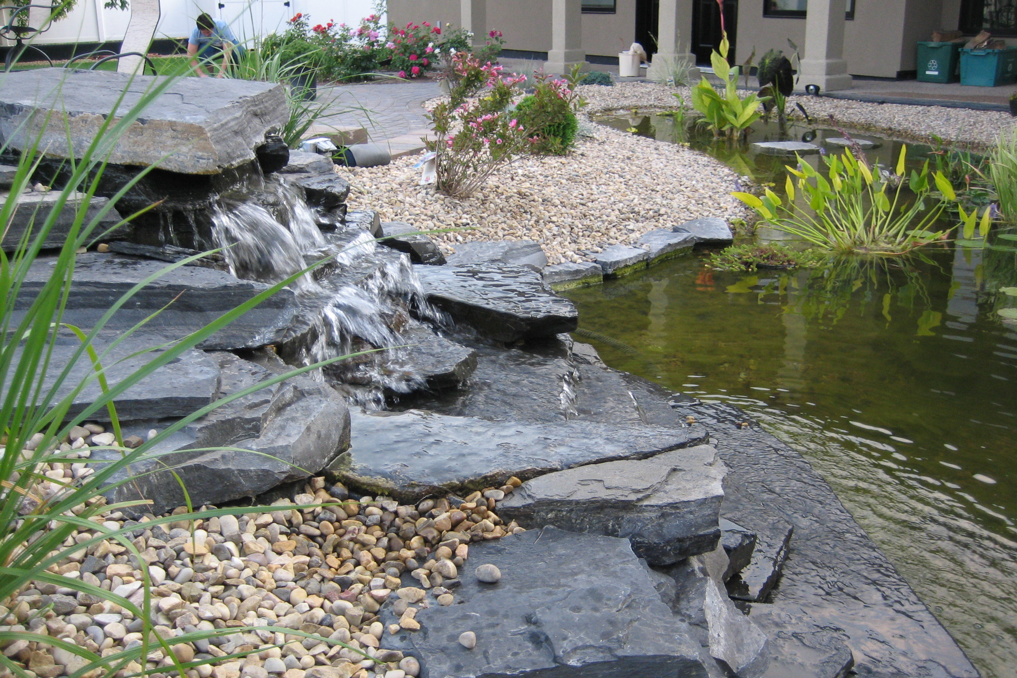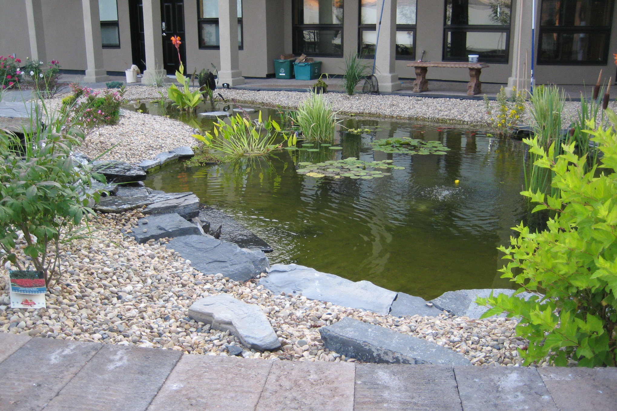 /This show-stopping backyard’s main feature is a flagstone-bordered koi pond with waterfall. These homeowners chose a large patio for entertaining a large family, surrounded by low-maintenance gravel and perennials. A graduated-height garden wall separates the patio and pond from the lawn.