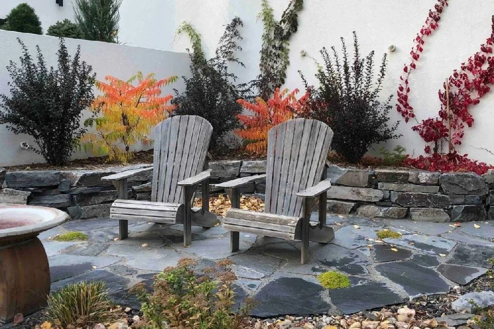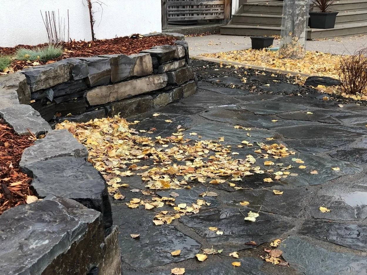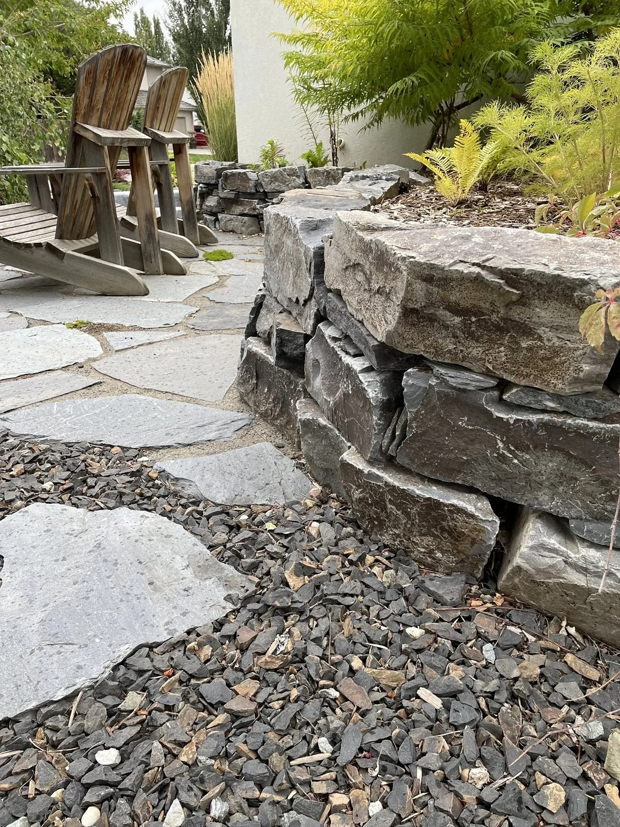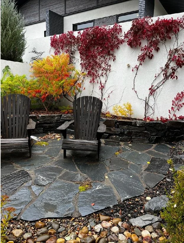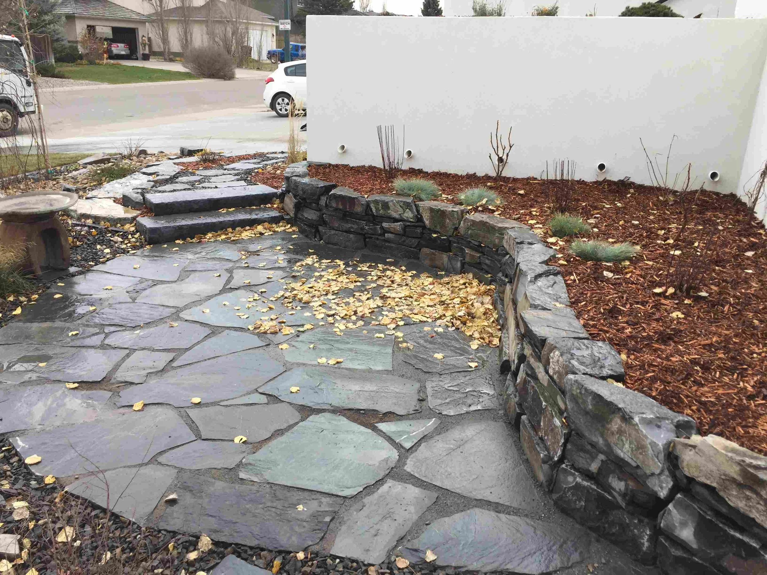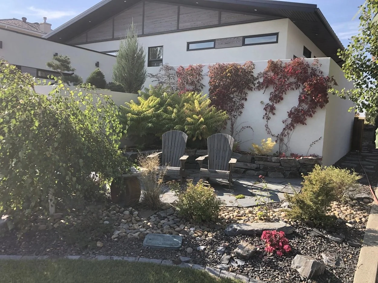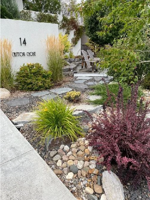 /The design for the McCallum Project includes a front-yard flagstone patio surrounded by drought-resistant perennials, natural stone garden walls, decorative gravel and boulders. Further complementing the home’s modern architecture, stepping stones lead to the backyard’s raised cedar garden planters. perennial beds, edged with paving stone, separate the fence from the lawn.