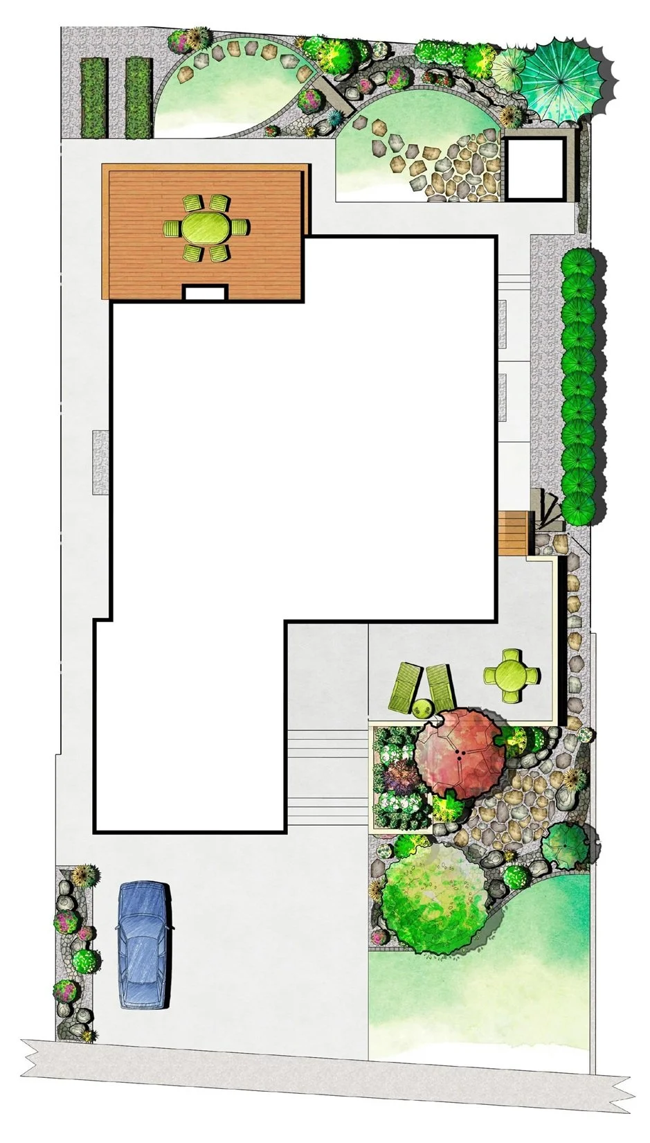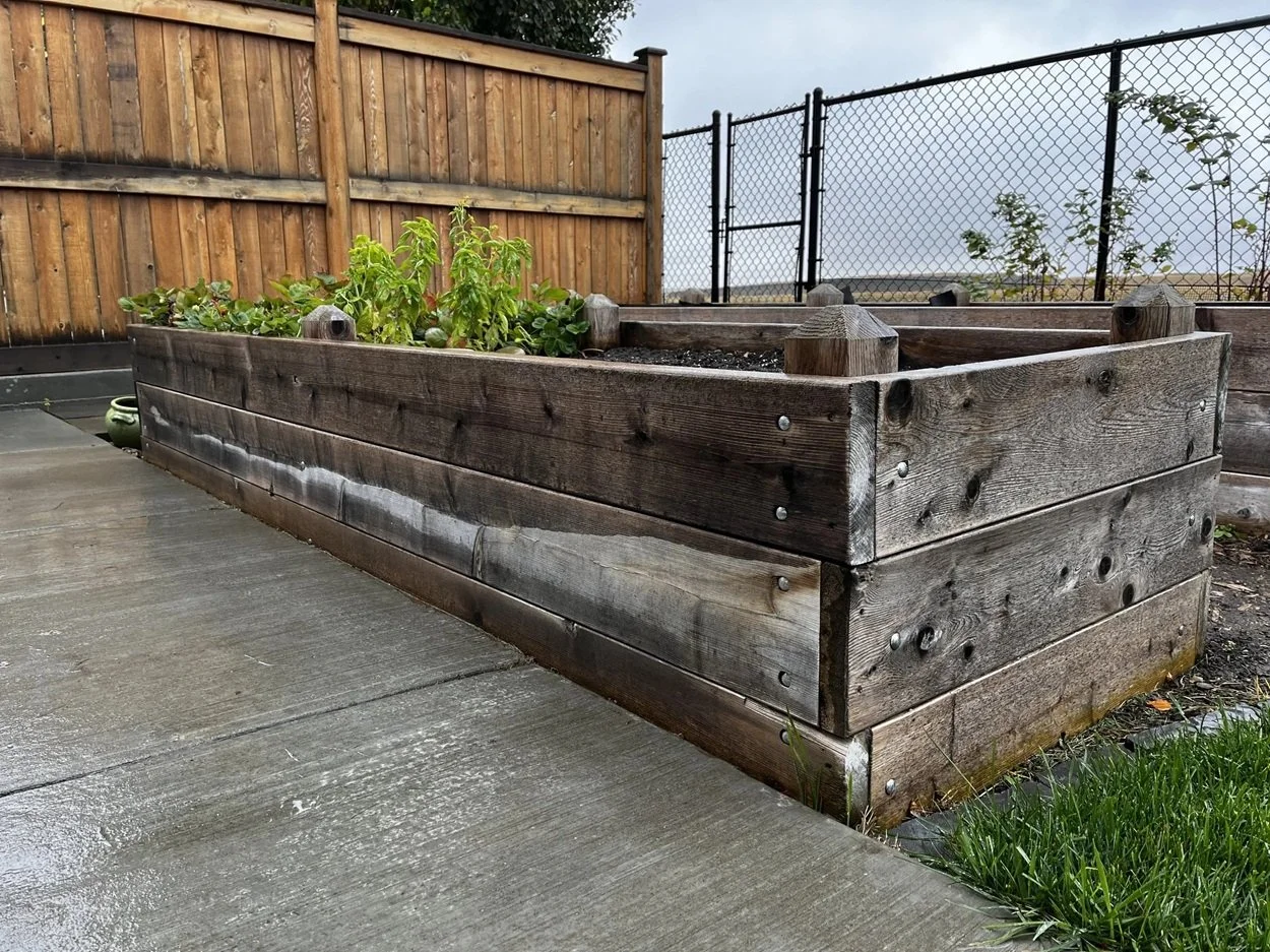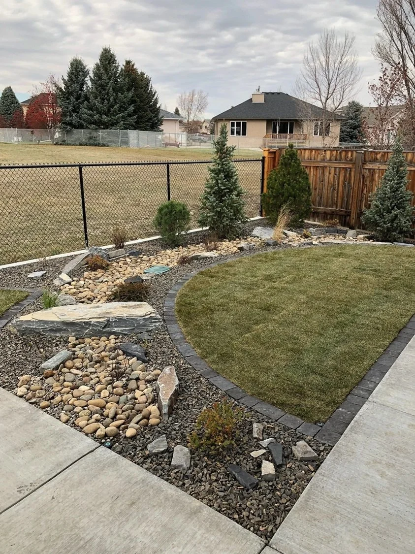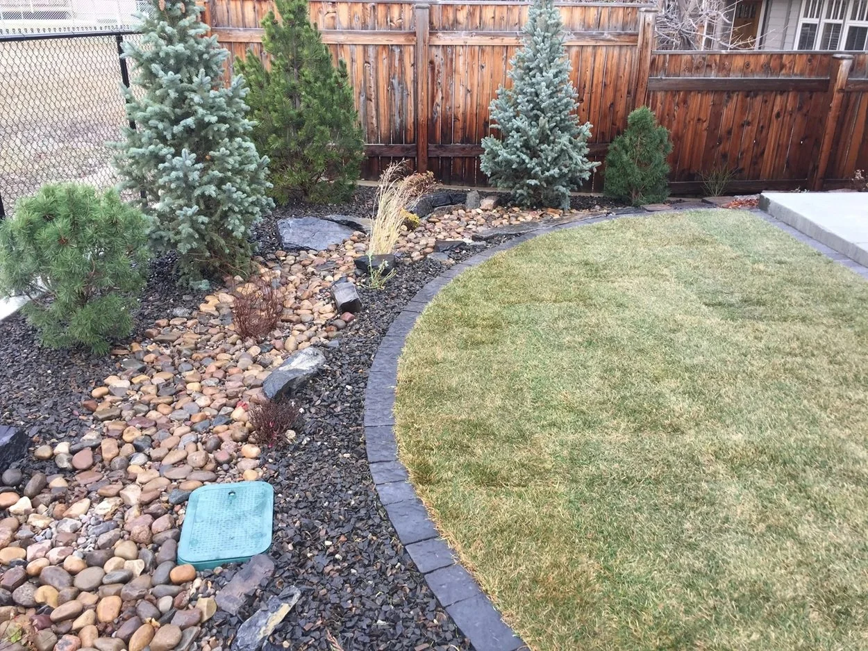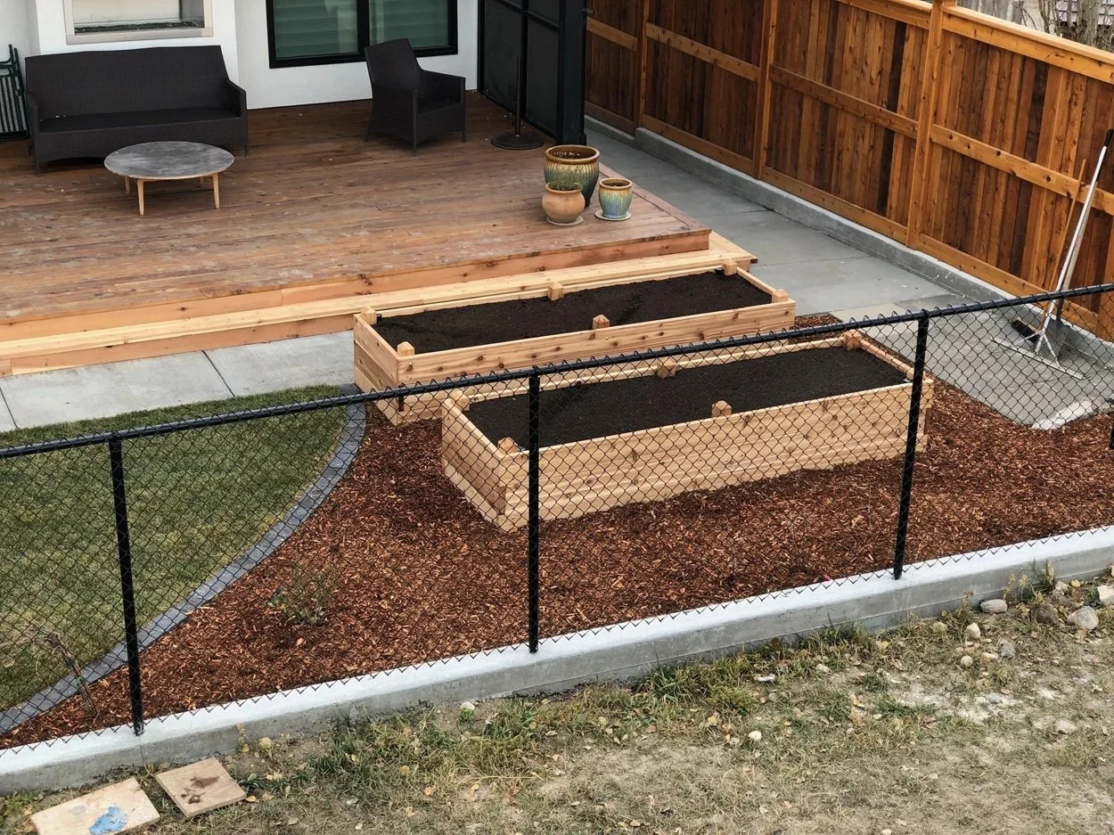 /The design for the McCallum Project includes a front-yard flagstone patio surrounded by drought-resistant perennials, natural stone garden walls, decorative gravel and boulders. Further complementing the home’s modern architecture, stepping stones lead to the backyard’s raised cedar garden planters. perennial beds, edged with paving stone, separate the fence from the lawn.